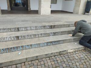 Zentrales Symbol war eine rot bemalte Bank mit der Aufschrift „Kaltern sagt Nein zu Gewalt an Frauen“, wobei die Farbe Alarm und Solidarität mit Betroffenen symbolisierte. Ergänzend schrieben die Schüler*innen mit Straßenkreide ausgewählte Catcalling-Sprüche auf die Stufen des Rathauses, auf Marktplatz und Paterbichl, um auf diese alltägliche Form der Belästigung aufmerksam zu machen.