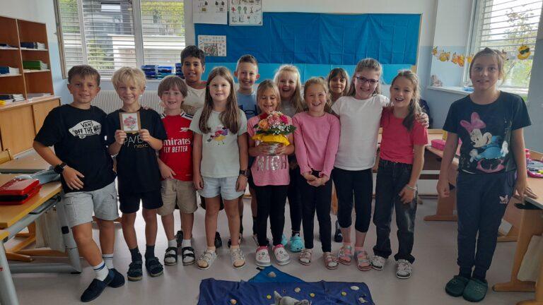 Das neue Schuljahr hatte gerade erst begonnen, da wartete in unserem Schulhaus schon eine wunderbare Überraschung. Ein liebevoll gebundener Blumenstrauß wurde vom Kindergartenteam an uns weitergereicht. Es waren sogenannte „Wander-Blumen“, über die man sich eine Stunde